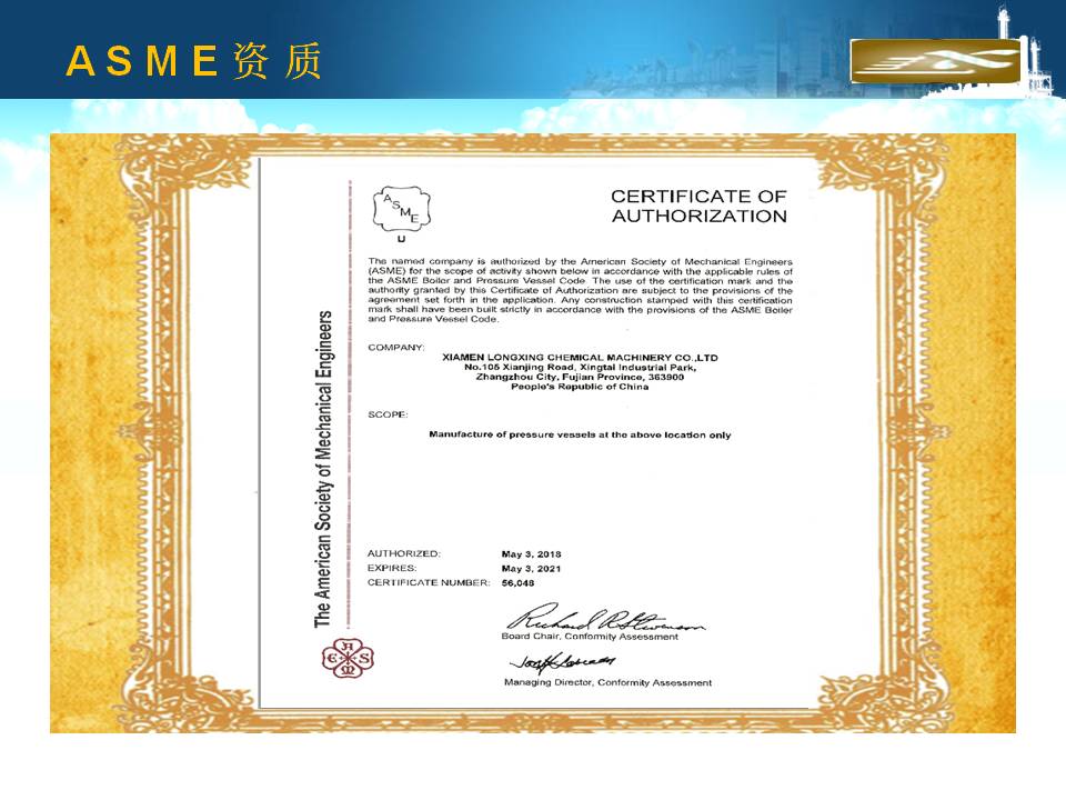 廈門隆興化工機械有限公司成立于2001年5月,占地面積30000平方米,擁有生產車間面積10000平方米及相關配套的辦公場所3000平方米,其中下料場所1000平方米,不銹鋼制作場所2000平方米,ASME產品制作區域1200平方米,無損曝光室30平方米。公司有職工135人,擁有專業的技術人員和管理人員36人。公司主要從事設計、制造A2級覆蓋D類壓力容器...
